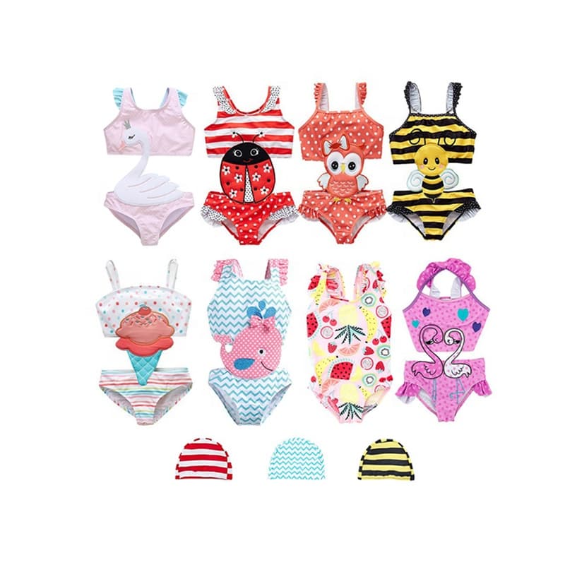 Customization Girls Swimwear Kids One Piece Hat Infantil Baby Swimsuit Ruffle Shoulder Straps Printed Children's Swimming Suit